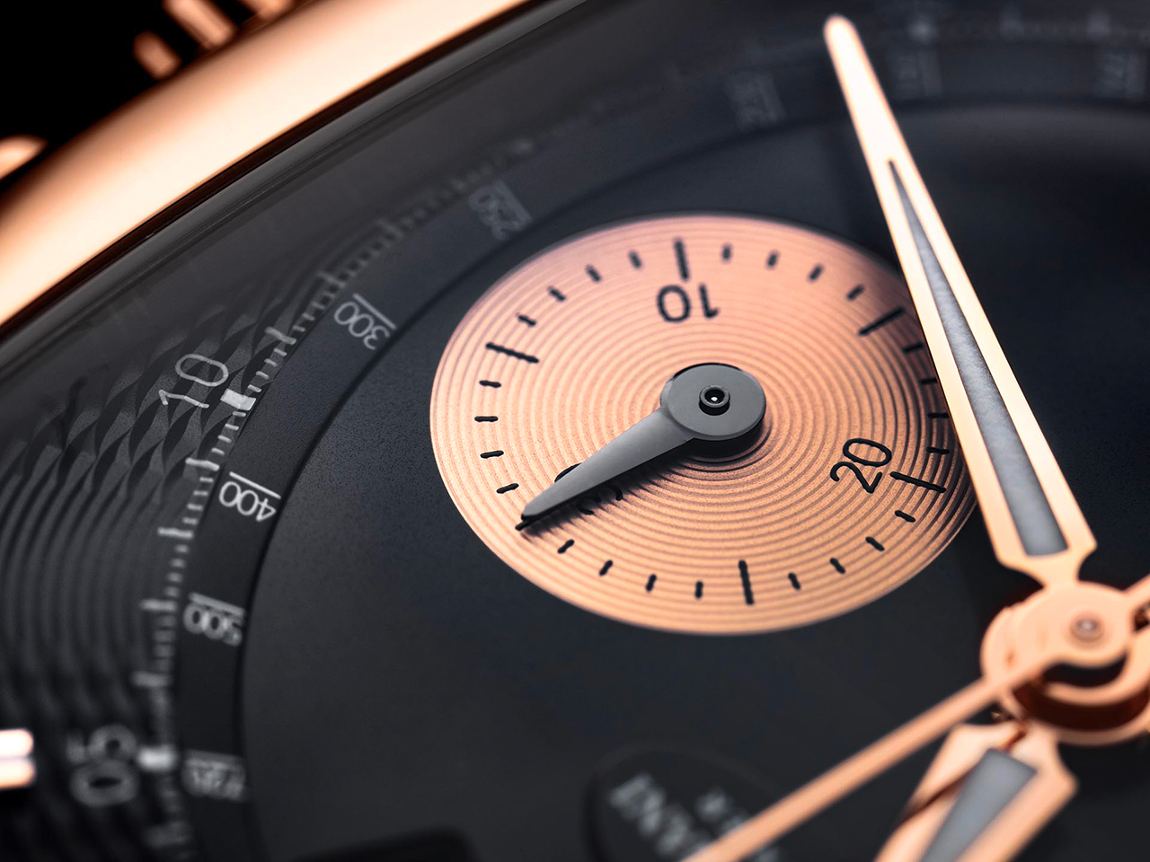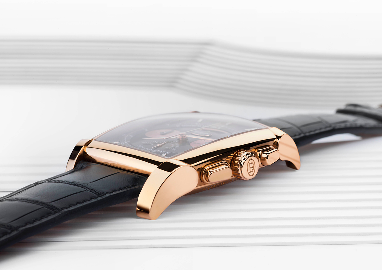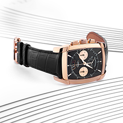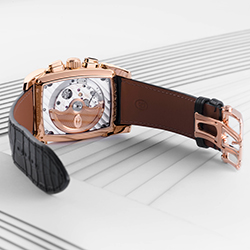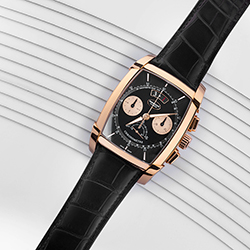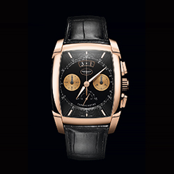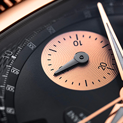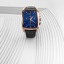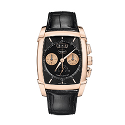 На проектирование и производство этого калибра у специалистов Дома ушло шесть долгих лет. Он работает с частотой 36000 полуколебаний в час (5 герц) и показывает время с точностью до десятых долей секунды. Делает он это с помощью колонного колеса и вертикального сцепления, повышающих точность хронографической функции и удобство при работе с ней. В дополнение к перечисленному здесь имеется балансовое колесо с регулируемой инерцией, закрепленное на мосту. Оно обеспечивает стабильность его колебаний и устойчивость к внешним воздействиям. Идеально вписанный в полированный вручную бочкообразный корпус размерами 48,2х40,4 мм, водонепроницаемый до глубины 30 метров, этот передовой механизм демонстрирует свой элегантный декор. В частности, это ротор автоподзавода из 22-каратного золота с «зерновым» гильоше. Циферблат разделен на несколько уровней. Матированный центр покрыт синим PVD-напылением, а края украшены узором гильоше и размечены накладными, установленными вручную фацетированными метками. Два счетчика, покрытых круговым узором, обрамлены золотыми ободками. Вокруг них идет под углом тахиметрическая шкала, над ними расположена апертура указателя даты, а под ними – две секторные секундные шкалы с двусторонней стрелкой. Покрытые люминофором стрелки формы Delta, слегка смещенные вверх от центральной оси счетчики и изогнутое окно указателя даты формируют легко читаемый циферблатный интерфейс. Завершает картину черный ремешок из кожи аллигатора с раскладывающейся застежкой из розового золота.