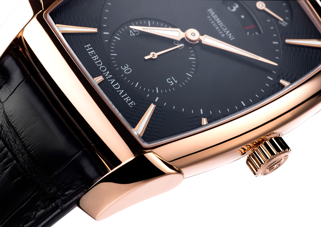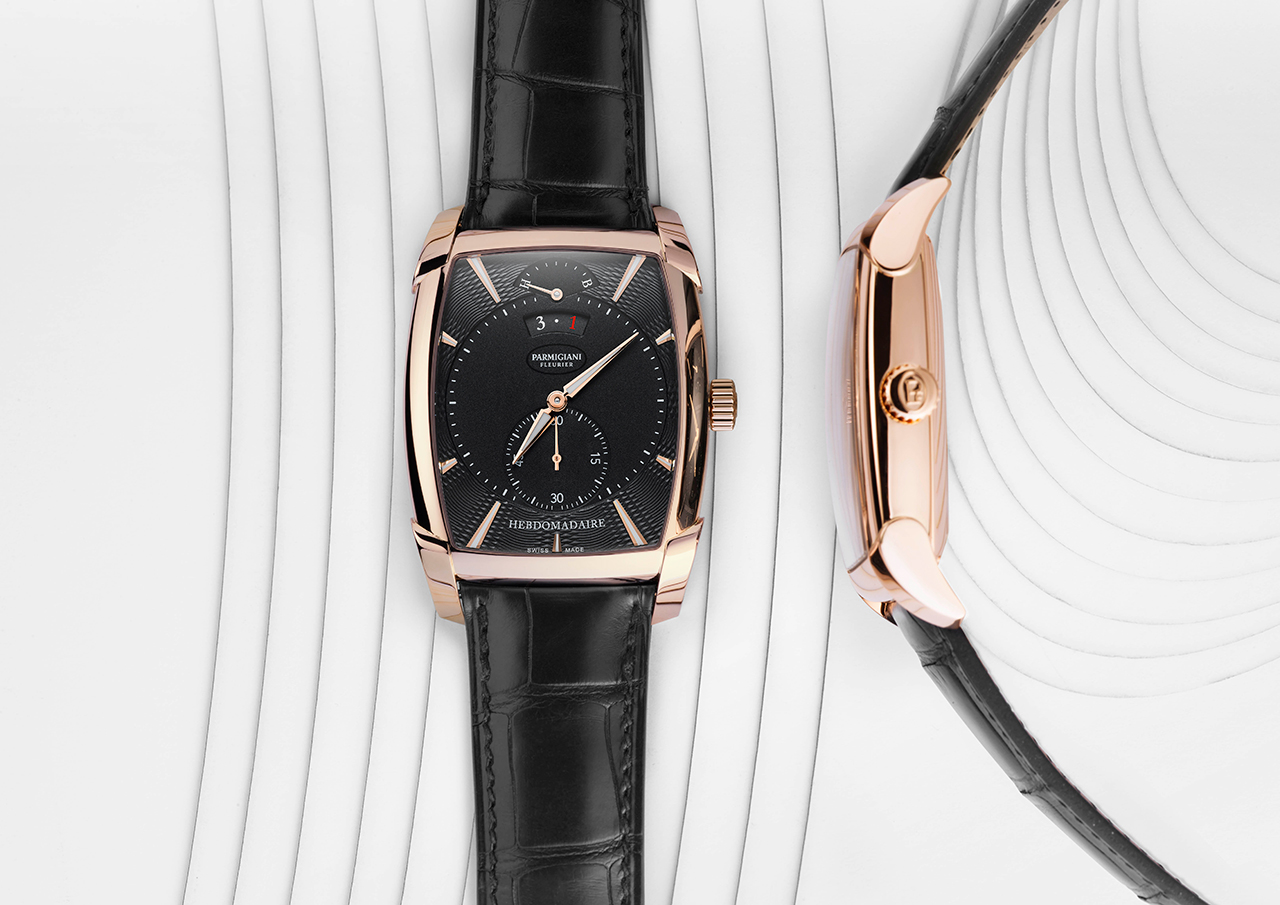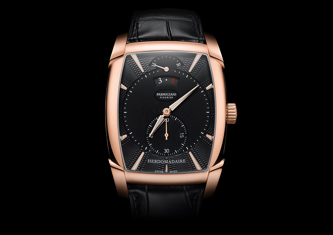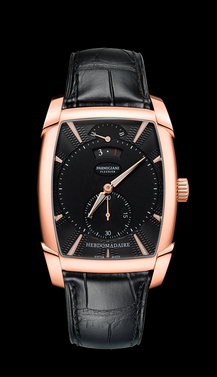 Новая Kalpa Hebdomadaire отдает должное истории линейки Kalpa и первому фирменному механизму бочкообразной формы. Построенный Мишелем Пармиджани в 1998 году и год спустя удостоившийся награды за новаторство, калибр PF110 с ручным заводом обладает впечатляющим 8-дневным запасом хода. Он обеспечивается двумя последовательно соединенными заводными барабанами. Это знаковое произведение высокого часового искусства отсчитывает часы и минуты, приводит в движение малый секундный счетчик на отметке «6 часов», указатель даты и недельного запаса хода.
