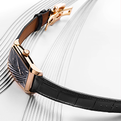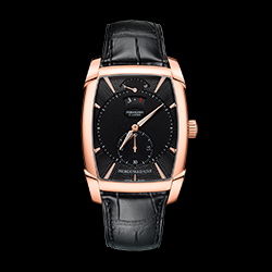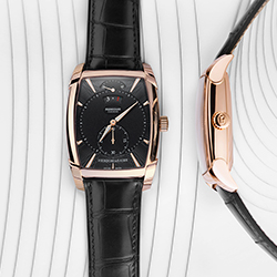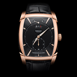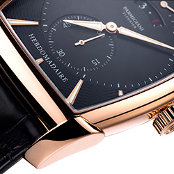Для лучшей читаемости счетчики увеличены и размещены чуть выше центральной оси, а в изогнутой апертуре с золотой окантовкой на отметке «12 часов» вращается диск указателя даты с белыми арабскими цифрами и золоченой цифрой «1». Покрытые люминофором стрелки формы Delta отсчитывают время по накладным (вручную) фацетированным меткам из розового золота, которые также покрыты люминесцентным составом и идеально совпадают по стилю с раскладывающейся застежкой на ремне Hermes из черной кожи аллигатора. Эти исключительные часы выпущены серией из 50 пронумерованных экземпляров.