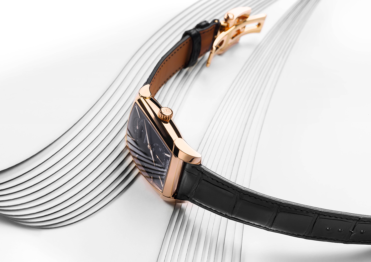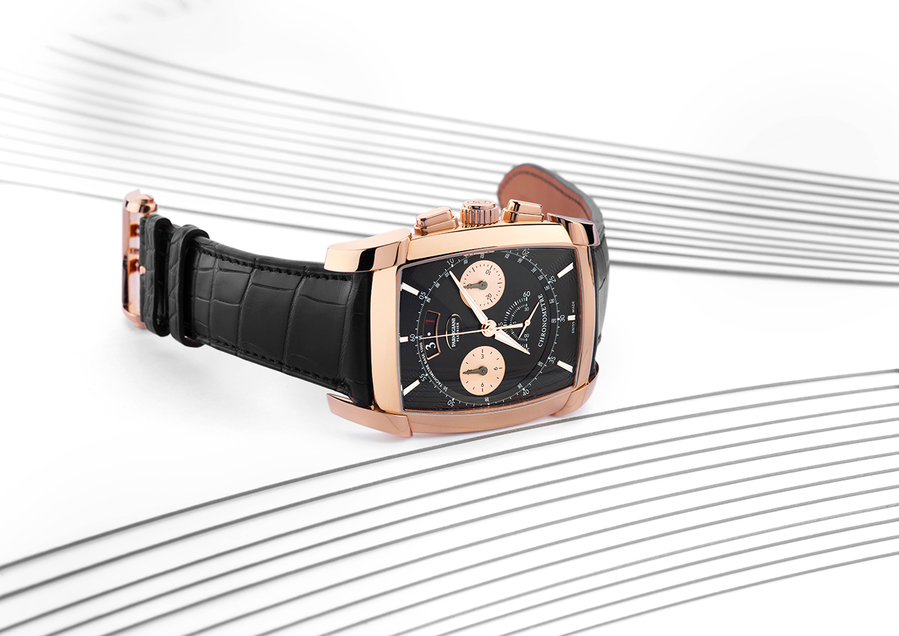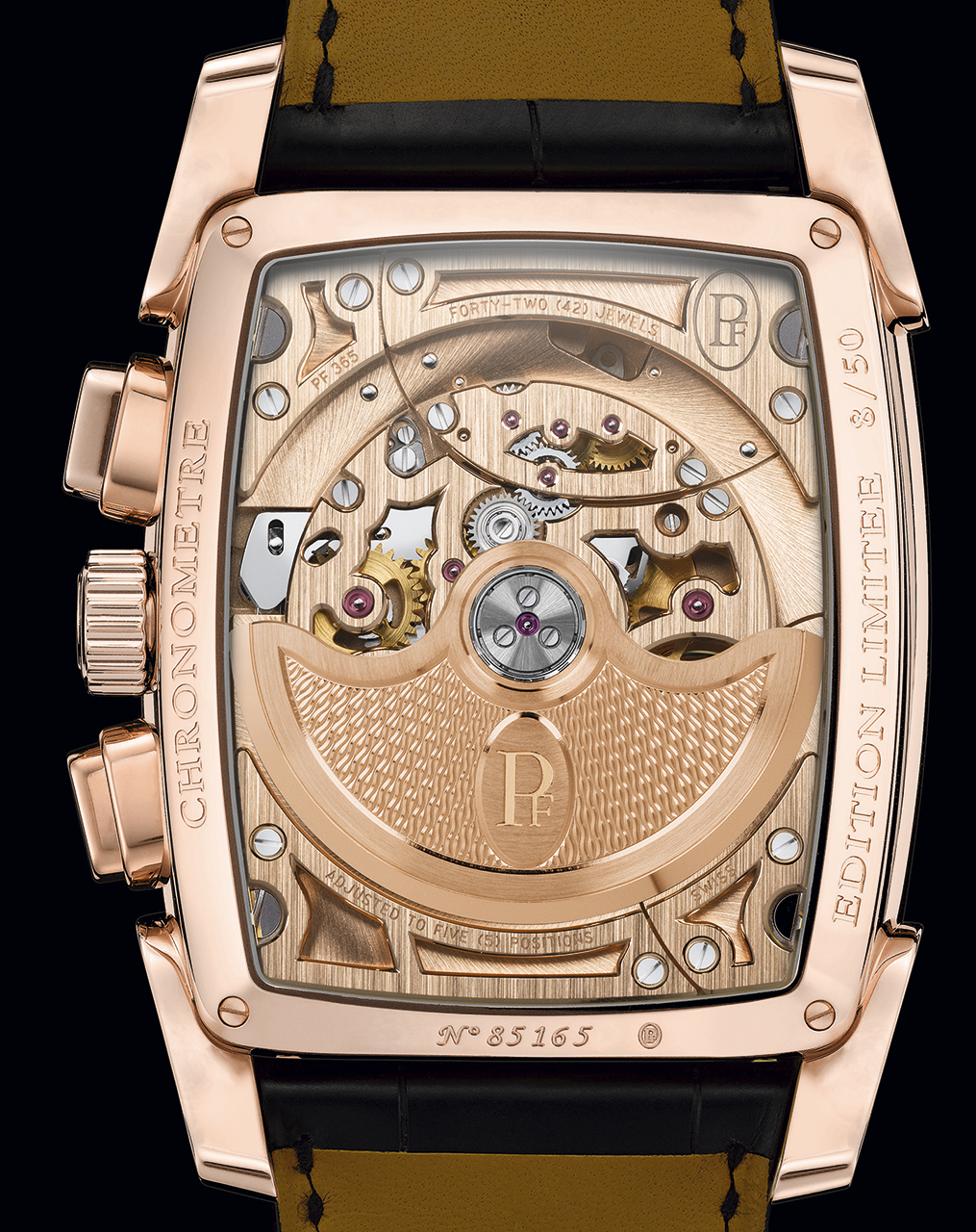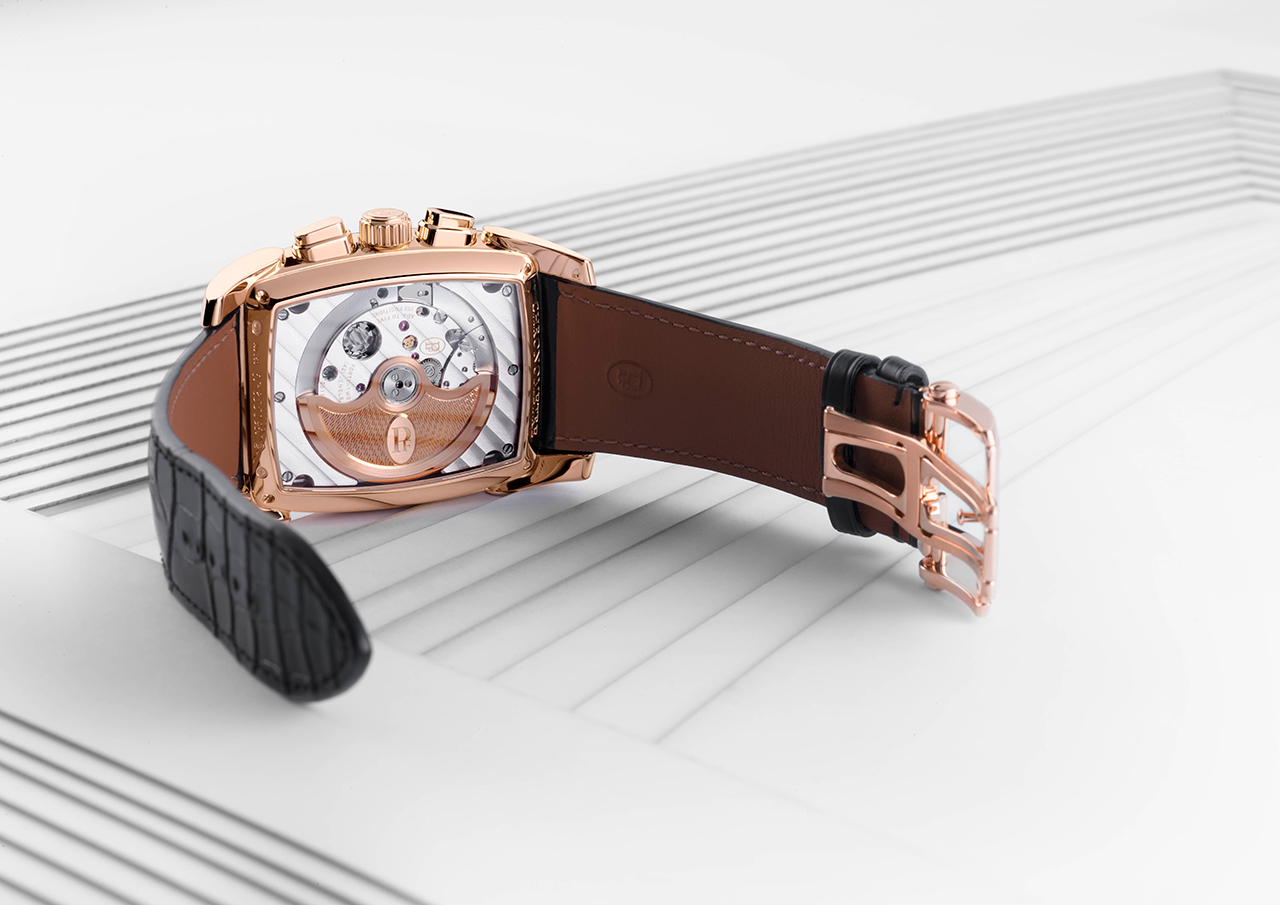 Что касается функций PF365, то на циферблате присутствуют часовая и минутная стрелки, малый секундный счетчик, а также счетчики хронографа со шкалой тахиметра и окном указателя даты. С обратной стороны бочкообразный калибр закрыт крышкой из сапфирового стекла, позволяющей рассмотреть его в деталях (включая украшенный гильоше «ячменное зерно» ротор автоподзавода из 22-каратного золота). Двухуровневый черный циферблат из 18-каратного золота матирован по центру, гильоширован по краям и дополнен двумя вспомогательными счетчиками с круговым узором.