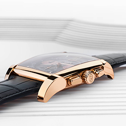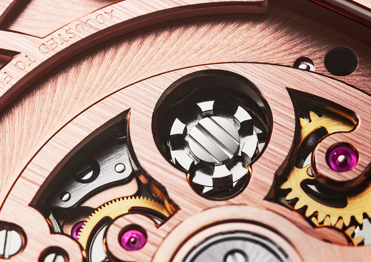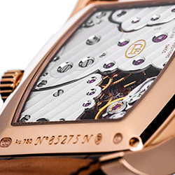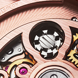 Будучи достаточно мягким и непростым в работе материалом золото свидетельствует о высочайшем профессионализме специалистов Дома, который также подтверждается искусно скелетонированными мостами и их декором. Кроме того, имеется балансовое колесо с регулируемой инерцией, поддерживаемое двухопорным мостом, повышающим стабильность работы балансового узла и его и устойчивость к внешним воздействиям.