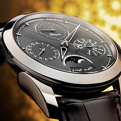 Модель Hijri Perpetual Calendar выполнена в платиновом корпусе диаметром 44,5 мм с грифельным циферблатом и платиновым ротором автоподзавода. Она показывает часы и минуты, а также дату индо-арабскими цифрами, название и продолжительность месяца на арабском языке, а также обычные и високосные годы. Кроме того, здесь имеются указатели лунных фаз с диском из авантюрина и 48-часового запаса хода. Как у всех часов Parmigiani Fleurier все без исключения детали механизма, включая скрытые от глаз, декорированы вручную специалистами мануфактуры.