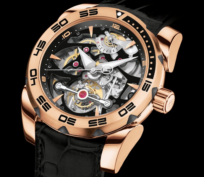 Еще одна заметная модель – Toric Tourbillon – часы с турбийоном и ручным подзаводом Limited Edition, корпус – 18-каратное розовое золото. Не многие часовые салоны могут позволить представлять на экспозиции часы с турбийоном – это сложнейший и дорогой механизм.