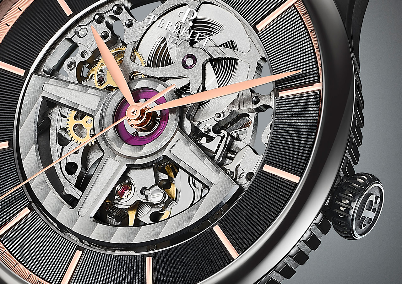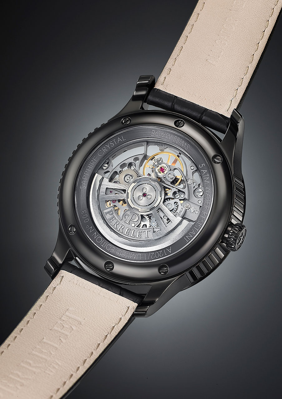 Скелетонизированный ротор с родиевым покрытием, расположенный на циферблате, украшен изысканной отделкой Côtes de Genève. Прозрачная задняя крышка из сапфирового стекла с антибликовым покрытием демонстрирует основной ротор с родиевым покрытием и логотипом Perrelet.