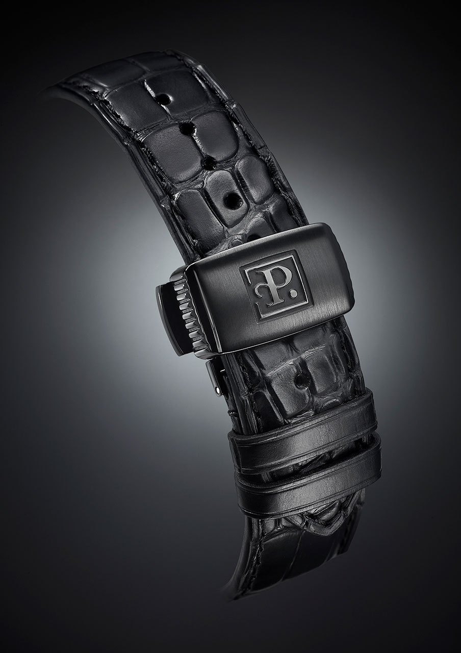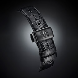 В качестве крепления часы First Class Double Rotor Black Edition имеют черный ремешок из крокодиловой кожи со складной застежкой, украшенной логотипом бренда.