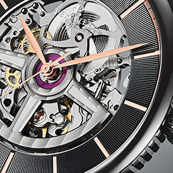 Центральные часовая, минутная и секундная стрелки, а также индексы выполнены из розового золота 4N. Все элементы из розового золота выделяются на фоне черного гильошированного кольца циферблата и подчеркивают цвет «минутной дорожки», расположенной по периметру.