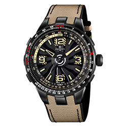 Чтобы обеспечить отличную читаемость показаний в любых условиях освещенности, стрелки, арабские цифры 3-6-9-12 и часовые индексы, нанесенные на сапфировое стекло, покрыты бежевым люминесцентным составом, которые гармонично сочетаются с полосками на нижнем циферблате. Ободок, вращающийся в двух направлениях, приводится в движение заводной головкой в положении «3 часа», а настройка времени осуществляется при помощи интегрированной заводной головки в положении «9 часов». Крепление часов Turbine Pilot Grand Raid представлено на браслете из бежевого нейлона с раскладывающейся застежкой из стали с черным PVD-покрытием.