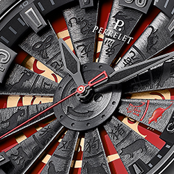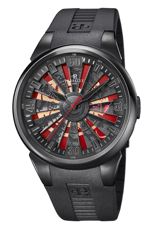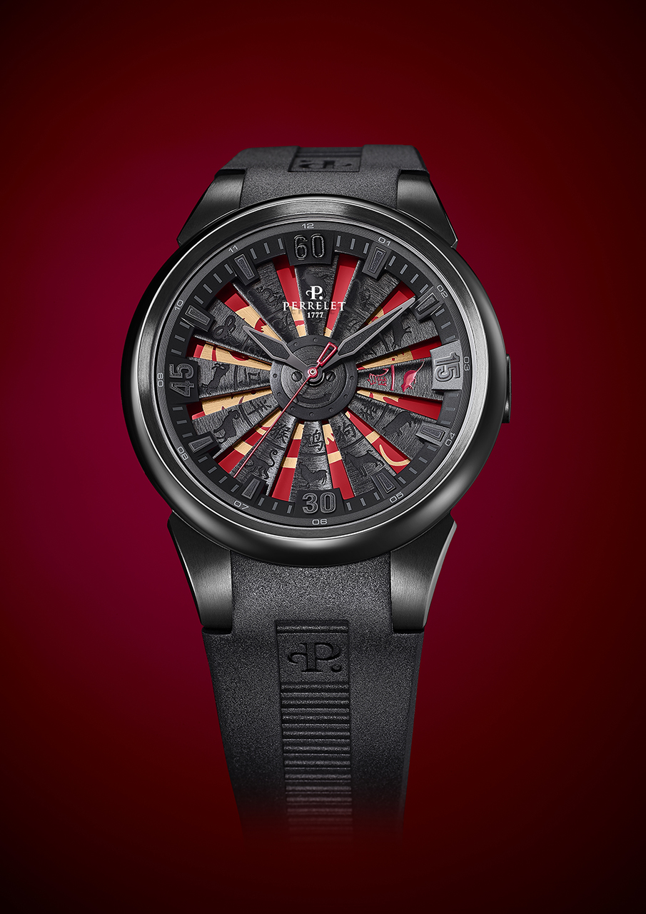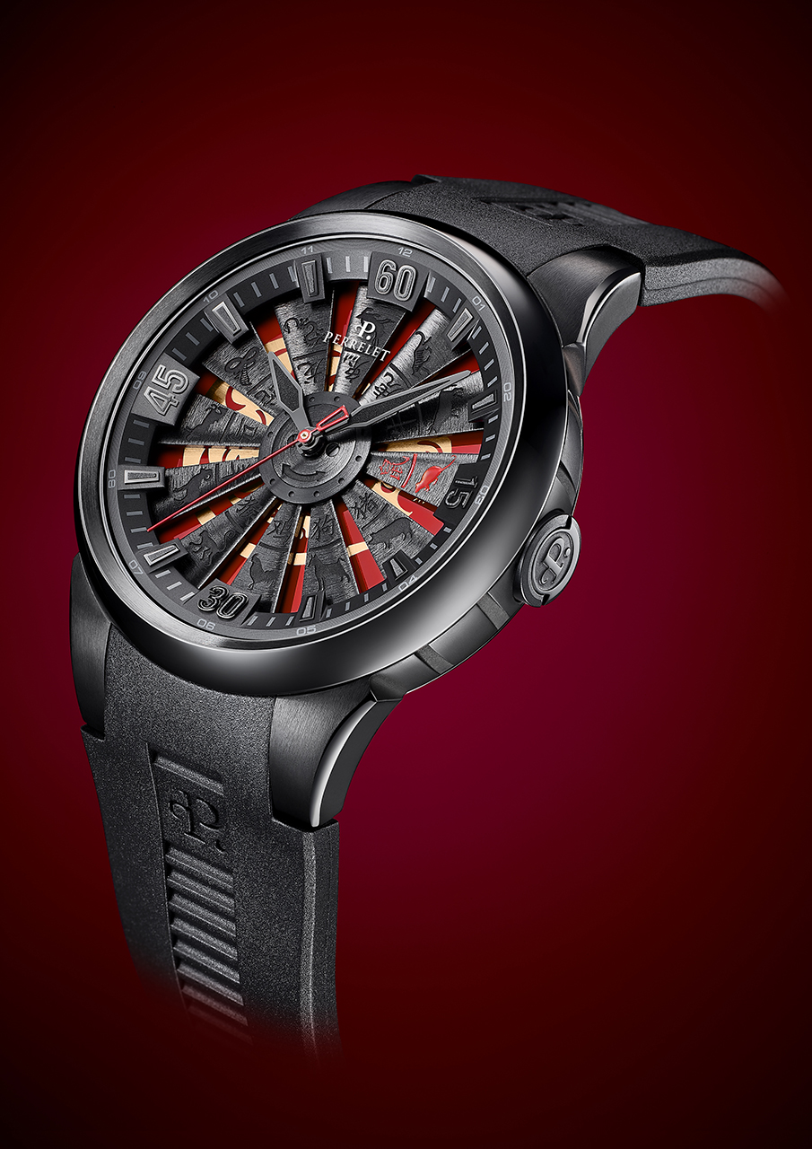 Часы Turbine Rat – показательный пример этого творческого процесса. В них применена легендарная конструкция турбинного ротора Perrelet Turbine, которая впервые представлена на рынке всего десять лет назад. С тех пор турбинный ротор Perrelet воспринимается как один из бесспорных символов бренда вместе с другим изобретением – фирменной конструкцией двойного ротора Double Rotor.