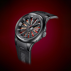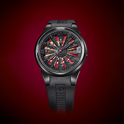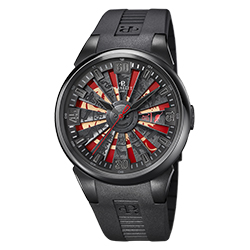 Стальной корпус часов Turbine Rat диаметром 44 мм с черным PVD-покрытием обладает водозащитой до 50 м и оснащен таинственным анимированным циферблатом. Циферблат, защищенный сапфировым стеклом, привлекает и словно гипнотизирует взгляд. Сложная структура циферблата, состоящего из нескольких элементов, является настоящим техническим прорывом бренда.