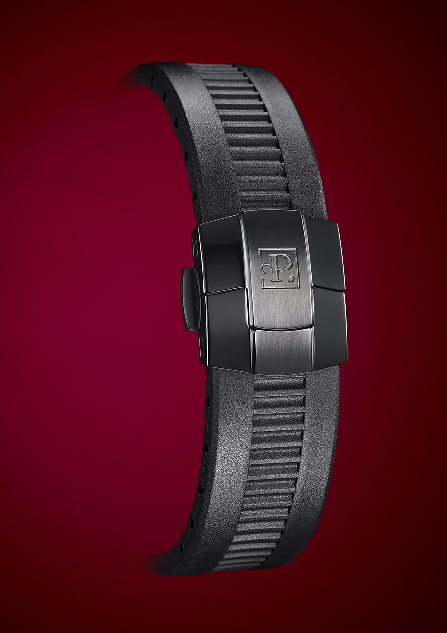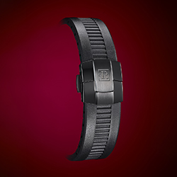Часы предлагаются на черном каучуковом ремешке, который украшен логотипом бренда. Раскладывающаяся застежка ремешка изготовлена из стали с черным PVD-покрытием. Новая модель выпущена лимитированной серией из 100 экземпляров.