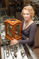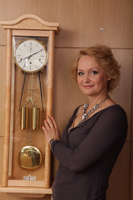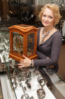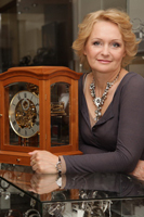 Данную модель отличает благородный корпус из вишни с изящно изогнутыми стенками и дверцей, маленький ящик для ключа, открытый серебряный циферблат с секундной стрелкой, стрелки в стиле Бреге. "Есть в этих часах что-то волшебное, а ведь нам в жизни, порой, так недостает волшебства", - раскрыла суть обаяния в перерыве между кадрами Татьяна.