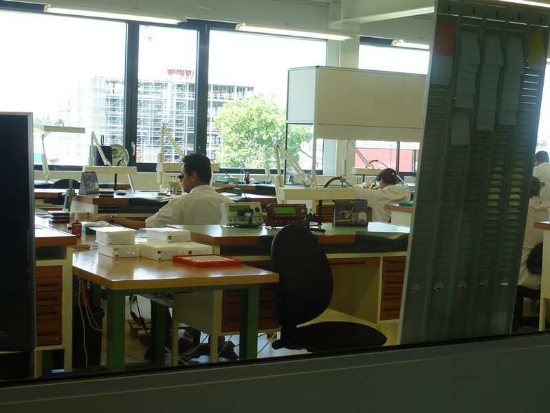 Конечно, мы наблюдали из-за стекла, потому что сам процесс сборки - стерильный. В мастерские заходят в специальной одежде, а некоторые из этапов делают в перчатках. На столах - идеальная чистота, стоит только аппаратура и приборы. Показали нам и образцы механизмов Frederique Constant - особенно интересно было, потому что мы увидели его в разобранном состоянии, все детали, все гравировки.