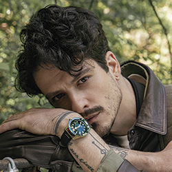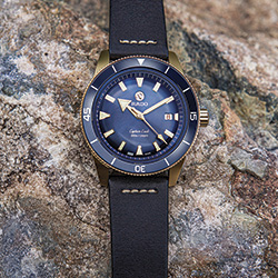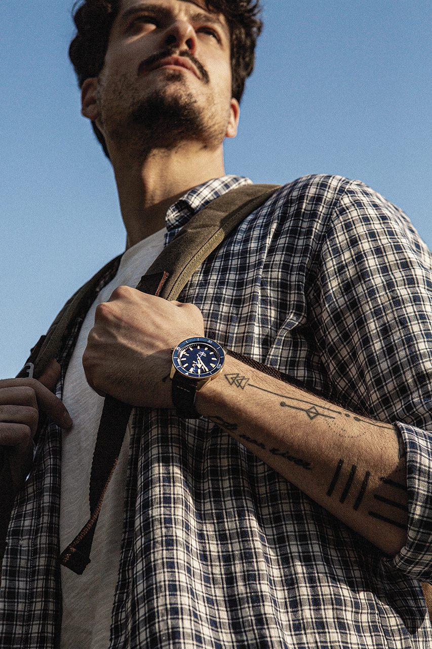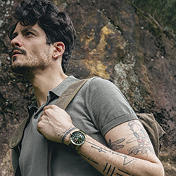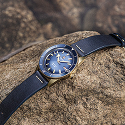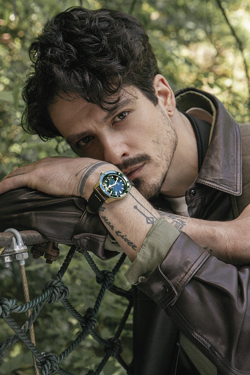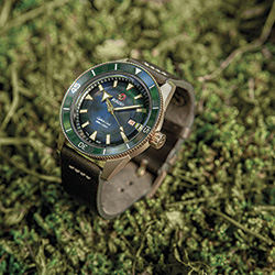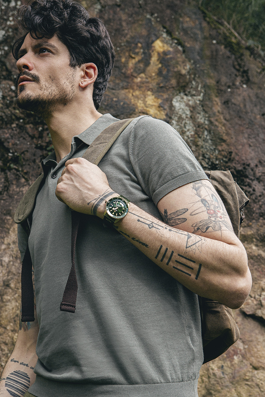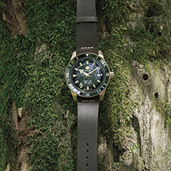 Гармония двух цветов достигнута за счет сочетания бронзового корпуса, выпуклого (box-shaped) сапфирового стекла, бронзового безеля со вставками из зеленой высокотехнологичной керамики и задней крышки корпуса из титана с сапфировым стеклом. Ремешок из темно-зеленой кожи завершает цветовое сочетание.