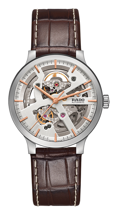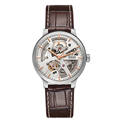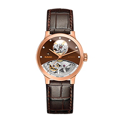 4. Rado Centrix Automatic Open Heart Gent 01.734.0179.3.030 Корпус из нержавеющей полированной стали. Скелетонированный циферблат шоколадно-коричневого цвета с покрытыми родием центральными стрелками и условными накладными часовыми индексами. Задняя крышка корпуса из прозрачного сапфира. Браслет из нержавеющей полированной стали с шоколадно-коричневыми полированными промежуточными звеньями из высокотехнологичной керамики и раскладывающейся титановой застёжкой. |