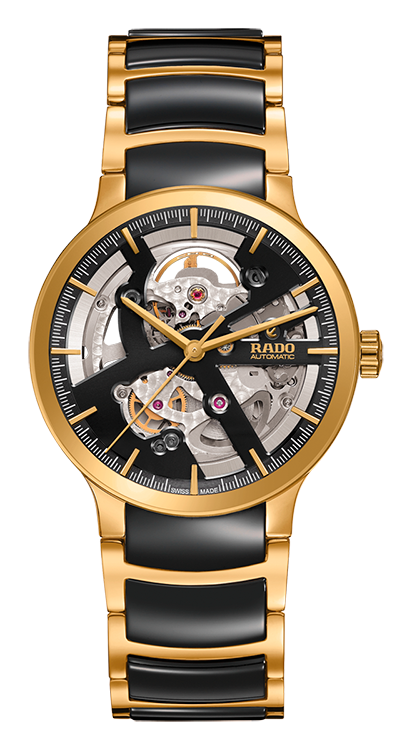 2. Rado Centrix Automatic Open Heart Gent 01.734.0180.3.016 Корпус из нержавеющей полированной стали с PVD-покрытием жёлтым золотом. Тёмно-серый скелетонированный циферблат с центральными жёлто-золотыми стрелками и условными накладными жёлто-золотыми часовыми индексами. Задняя крышка корпуса из прозрачного сапфира. Браслет с раскладывающейся застёжкой из нержавеющей полированной стали с жёлто-золотым PVD-покрытием и тёмно-серыми полированными промежуточными звеньями из высокотехнологичной керамики. |
