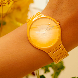 Следующая модель отражает радостное настроение лета. Корпус конструкции моноблок выполнен из высокотехнологичной керамики желтого цвета и дополнен циферблатом с градиентом от серебристого к желтому, защищенным сапфировым стеклом в огранкой в форме солнца. Заводная головка и браслет изготовлены из керамики солнечно-желтого цвета, чтобы сочетаться с корпусом и окантовкой циферблата. Титановая трехзвенная застежка и задняя крышка корпуса, защищенная сапфировым стеклом с надписью GREAT GARDENS OF THE WORLD дополняют все модели линии.