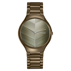 Осень воплощает модель в темно-оливковом оттенке. Стекло со специальной огранкой в виде листка защищает циферблат с градиентом от серебристого к оливково-зеленому, окантовку оливково-зеленого цвета и логотип Rado темно-серого цвета. Внутри этой модели, как и в других часах этой серии, сверхнадежный кварцевый механизм R420.