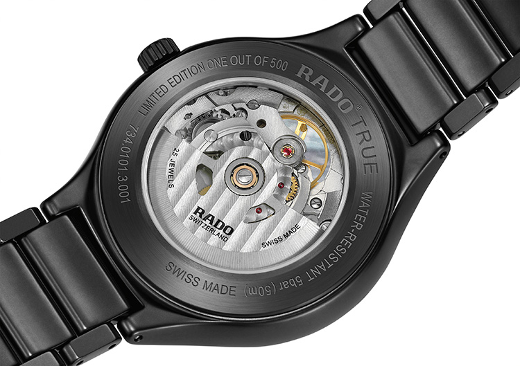 Прочное выпуклое сапфировое стекло защищает лицевую сторону корпуса, но оно также является частью конструкции завинчивающейся задней крышки, изготовленной из полированного титана с отделкой PVD-покрытием чёрного или белого цвета, выгравированными надписями: «Limited Edition one of 500 – Rado True – Water-resistant 5bar (50m) – Swiss made», и индивидуальным номером каждого экземпляра часов. На боковой стороне корпуса в направлении «3 часа» установлена рифлёная заводная головка с логотипом Rado на торце. Заводная головка, также как и корпус часов, сделана из высокотехнологичной керамики в соответствующем корпусу цвете. Корпус водонепроницаем при давлении до 5 атм., т.е. при погружении на глубину до 50 м.