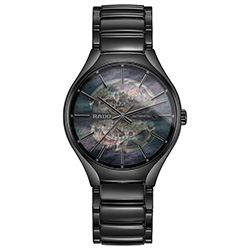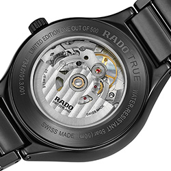 1. Rado True Open Heart (Black) Limited Edition, 734.0101.3.090 Корпус-моноблок из чёрной матовой высокотехнологичной керамики. Титановая задняя крышка с PVD-покрытием чёрного цвета. Полупрозрачный скелетонированный циферблат из чёрного перламутра, чёрные стрелки и условные индексы. Браслет из чёрной матовой высокотехнологичной керамики. |
