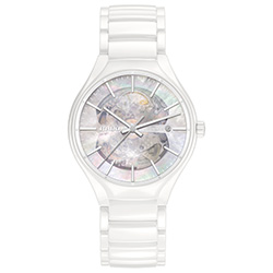 2. Rado True Open Heart (White) Limited Edition, 734.0106.3.090 Корпус-моноблок из белой полированной высокотехнологичной керамики. Титановая задняя крышка с PVD-покрытием белого цвета. Полупрозрачный скелетонированный циферблат из белого перламутра, белые стрелки и условные индексы. Браслет из белой полированной высокотехнологичной керамики. |