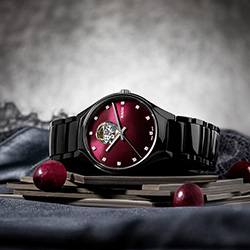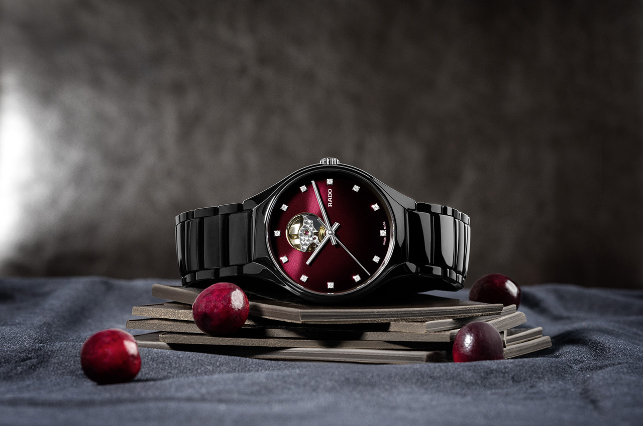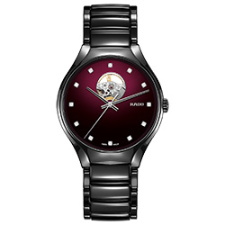 В часах Rado True Secret Ceramic безупречность керамики черного цвета объединяется с чувственным красным — цветом любви. Красный цвет присутствует на циферблате в виде мерцающих оттенков от темно-вишневого до черного. Цветовой градиент от насыщенного к более светлому подчеркивает мистическую ауру этих часов, чей секрет становится явью на 12-часовом делении. Сквозь маленькое круглое отверстие открывается часовой механизм: чутко сбалансированный и живой.