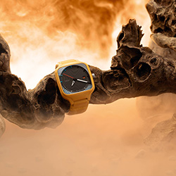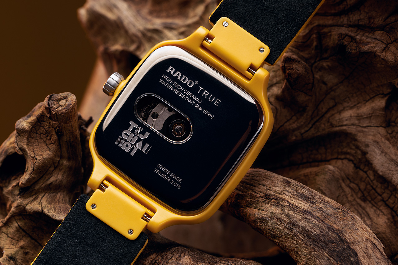 Основой послужила новая и революционная модель True Square — первые часы квадратной формы, выполненные из монолитной высокотехнологичной керамики. Ее обтекаемая форма была создана благодаря технологии инжекционного литья. Корпус из высокотехнологичной керамики желтого цвета с матовой текстурой сочетается с темно-серой задней крышкой корпуса из полированной нержавеющей стали с PVD покрытием с сапфировым стеклом и особой гравировкой. Дополнением послужил браслет, изготовленный из кожаных деталей в форме подушечек, скрепленных с помощью деталей из высокотехнологичной керамики. Завершает композицию застежка из нержавеющей стали с покрытием PVD темно-серого цвета.