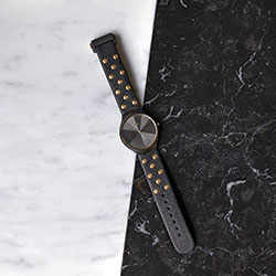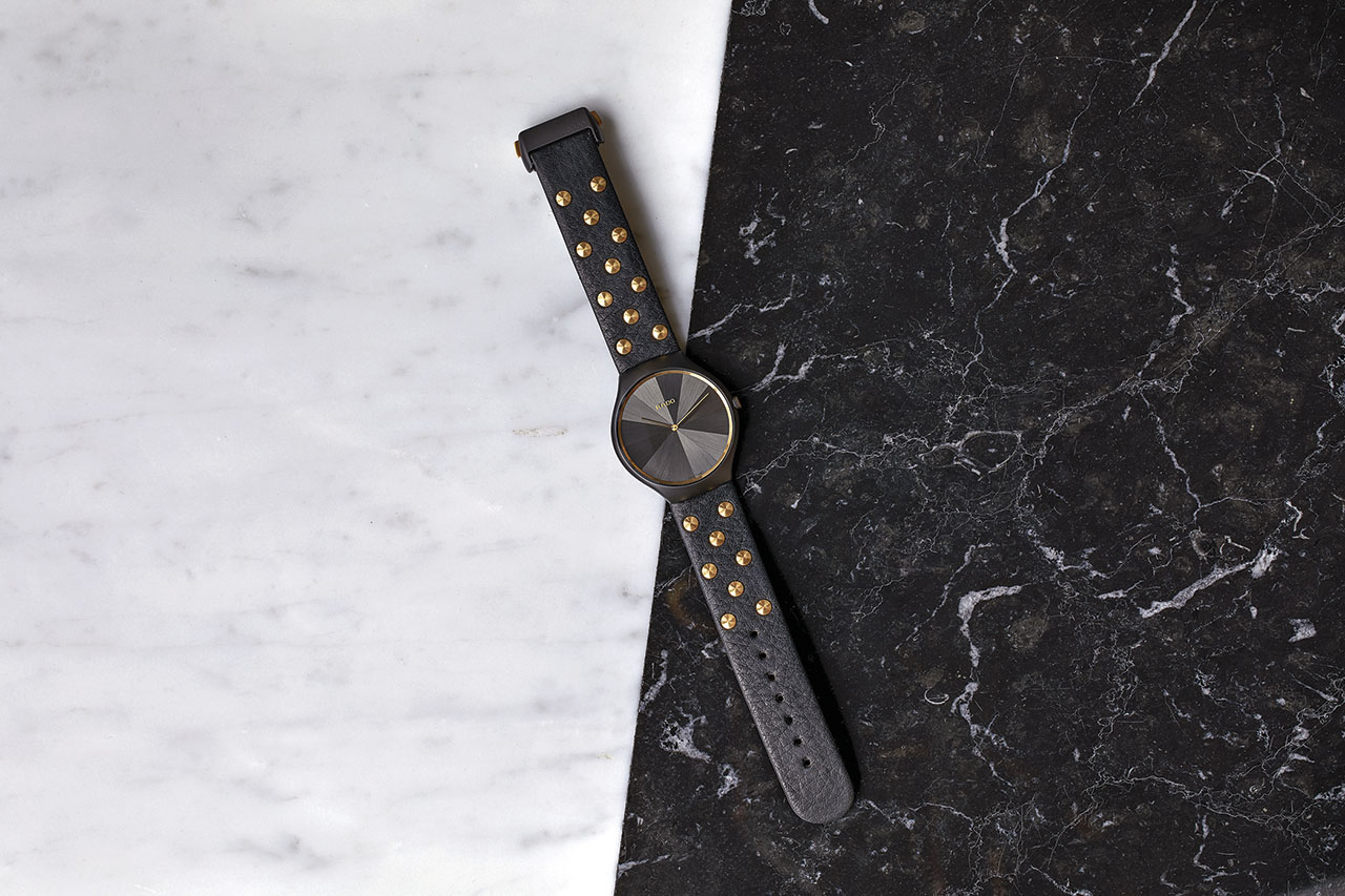 - Кожаный черного цвета с 19 скобами из нержавеющей стали c PVD покрытием цвета золота.