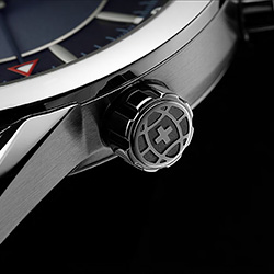 Корпус из нержавеющей стали диаметром 40,5 мм также играет с лучами света, иногда отбрасывая тени на ушки сложной формы или подчеркивая блеск полированного безеля. Команда дизайнеров RAYMOND WEIL приложила немало усилий на оптимизацию внешнего вида часов. Ее внимание вышло за рамки простой эстетики. Корпус тонкий – 9,7 мм, что вместе с продуманной задней крышкой и ушками способствует впечатляющей эргономике модели. Корпус оснащен двумя заводными головками, расположенными под углом: верхняя головка в положении «2 часа» служит для завода барабана и регулировки различных индикаторов времени, а головка в положении «4 часа» (на ее боку изображен швейцарский флаг) регулирует стрелку GMT.