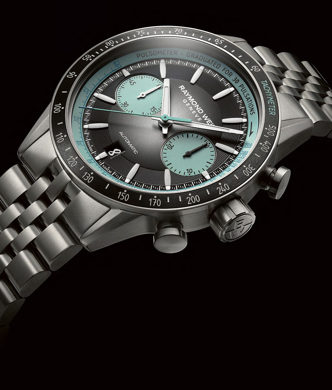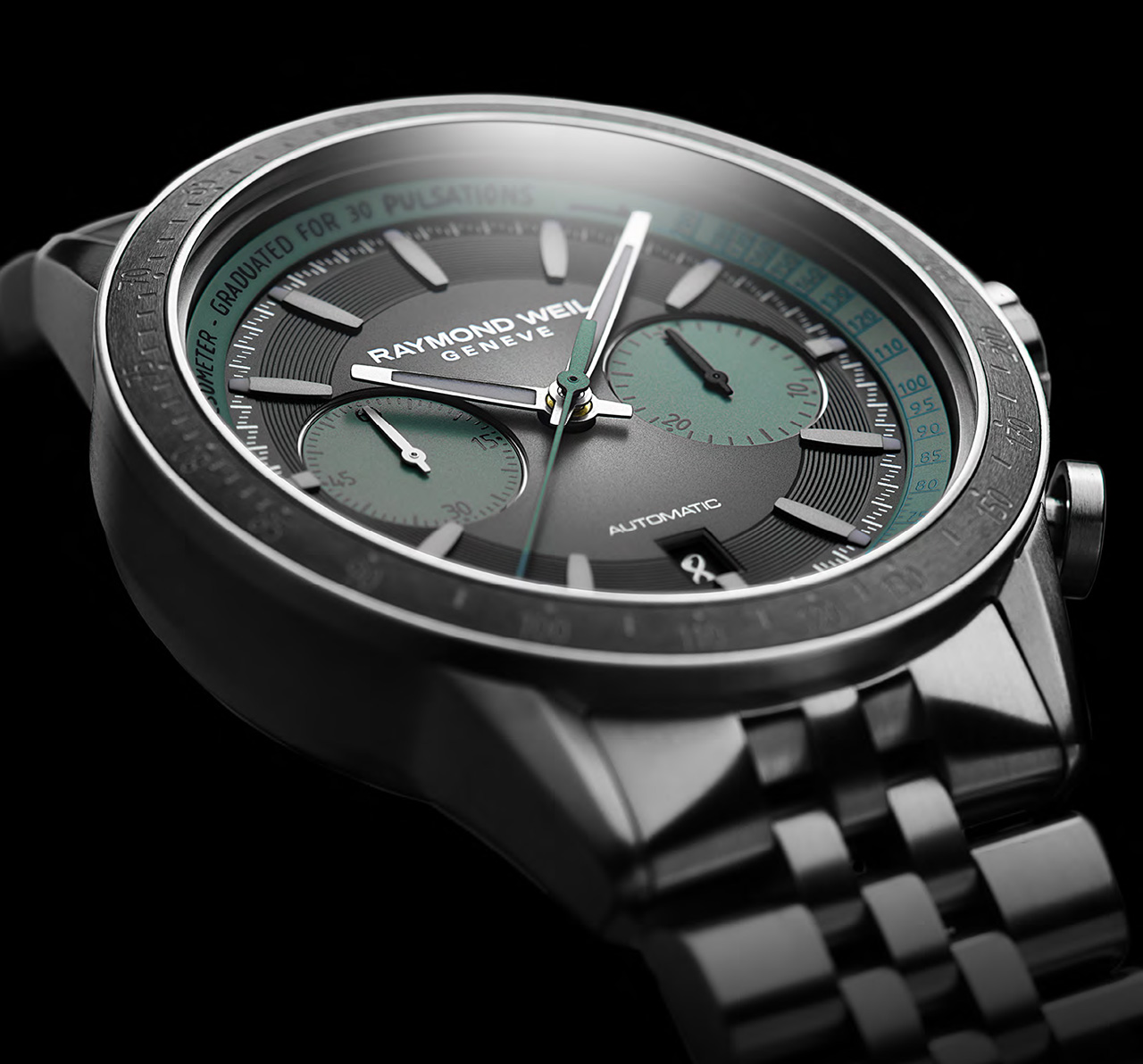 Титановый корпус размером 43,5 мм с черным керамическим тахиметрическим безелем обладает всеми признаками хронографа RAYMOND WEIL. Автоматический механизм RW5030, 56-часовой запас хода, завинчивающаяся и рифленая заводная головка с монограммой RW.