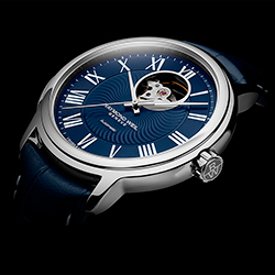 Модели Maestro Blues с выразительным дизайном наполнены волшебным звучанием блюзовых мелодий. Часы имеют корпус диаметром 40 мм, механизм с автоподзаводом, темно-синий циферблат, украшенный тонким рисунком в виде волн. Современные изящные стрелки гармонично сочетаются с белыми римскими цифрами. В часах Maestro Blues с PVD-покрытием из розового золота на циферблате расположено окошко даты на отметке «3 часа». Крышка корпуса из нержавеющей стали на отметке «12 часов» прозрачная. Это дает возможность увидеть внутреннее содержание часов и ритмичные колебания баланса. Обе модели имеют синий кожаный ремешок, украшенный белой прострочкой.
