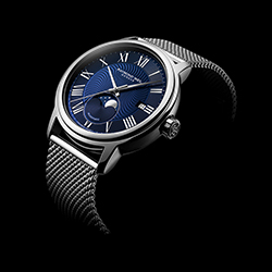 Часы Maestro Moon Phase оснащены швейцарским механизмом RW4280 с автоподзаводом, а изящный стальной корпус диаметром 40 мм придает им утонченный классический вид. Через отверстие в форме полумесяца над отметкой «6 часов» виден индикатор фаз Луны — поистине звездное зрелище.