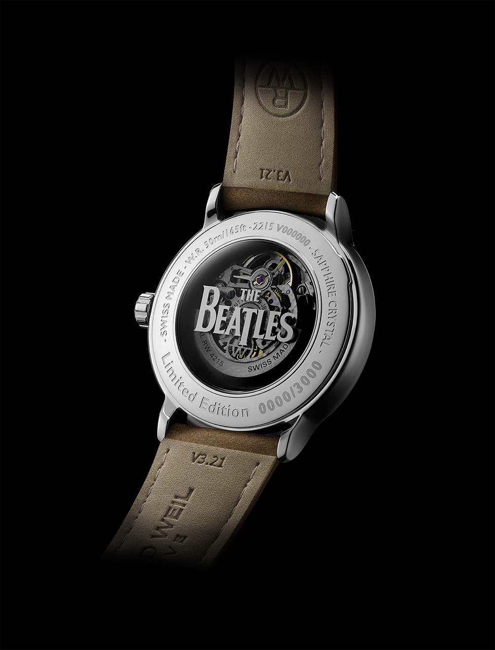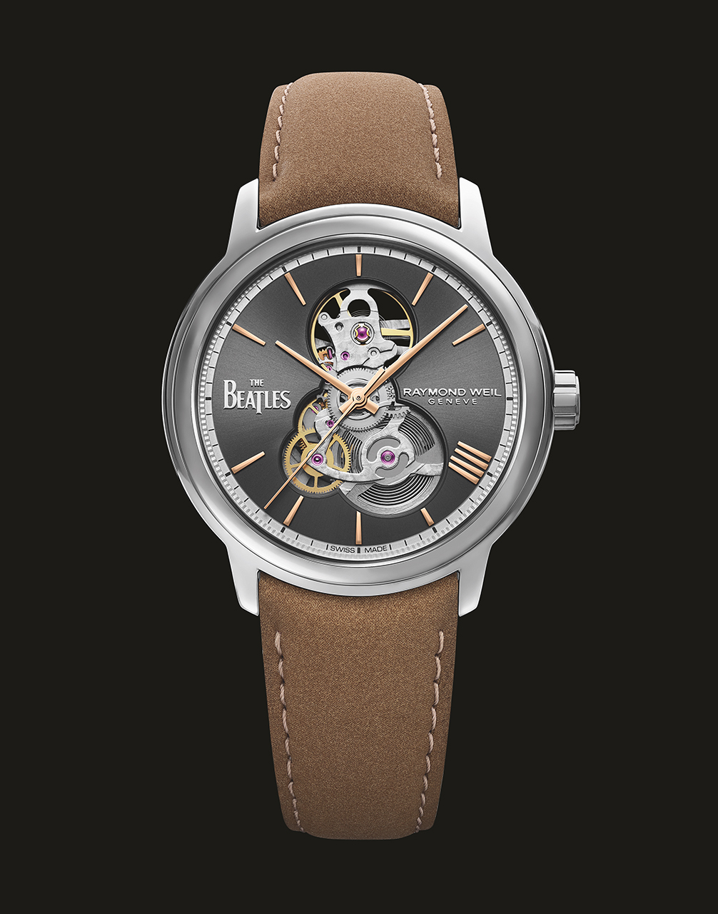 Антрацитовый циферблат контрастирует со стрелками и часовыми метками с PVD-покрытием розовым золотом, а указатель с четырьмя совмещенными индексами, расположенными на отметке «4 часа», представляет четырех участников The Beatles. Официальный логотип The Beatles расположен у отметки «9 часов» и на задней крышке корпуса, а логотип RAYMOND WEIL в положении «3 часа».