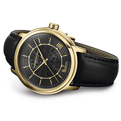Ремешок: из черного полиуретана («веган-кожи») со стальной раскладывающейся застежкой RW с PVD-покрытием из желтого золота и системой двойной блокировки.