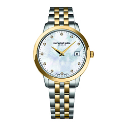 2. Raymond Weil Watch Toccata Nicola Benedetti Limited Edition (RW-1139) 5388 STP 970811 Круглый корпус часов, диаметром 34 мм и толщиной 7 мм, изготовлен из нержавеющей полированной стали. Безель имеет PVD-напыление из жёлтого золота. Стальная заводная головка также с PVD-напылением из жёлтого золота, а её торец украшен выгравированной монограммой «RW». Лицевая сторона корпуса закрыта изогнутым сапфировым стеклом, тыльная сторона – закрыта защёлкивающейся задней крышкой. Водонепроницаемость корпуса составляет 5 атм. (50 м). На перламутровом циферблате с 11 бриллиантами в виде условных часовых индексов, расположены центральные стрелки часов и минут формы «Дофин» с PVD-напылением из жёлтого золота и окошечко даты на отметке «3 часа». Общее количество бриллиантов в модели – 11. Вес – 0.04 карата. Огранка бриллиантов циферблата– Rond /8/8 - SI2 à SI1. Часы комплектуются стальным наборным браслетом и снабжены складной застёжкой с двойной блокировкой и декором в виде логотипа «RW». Чётные ряды браслета покрыты PVD-напылением из жёлтого золота. Модель доступна в продаже. |