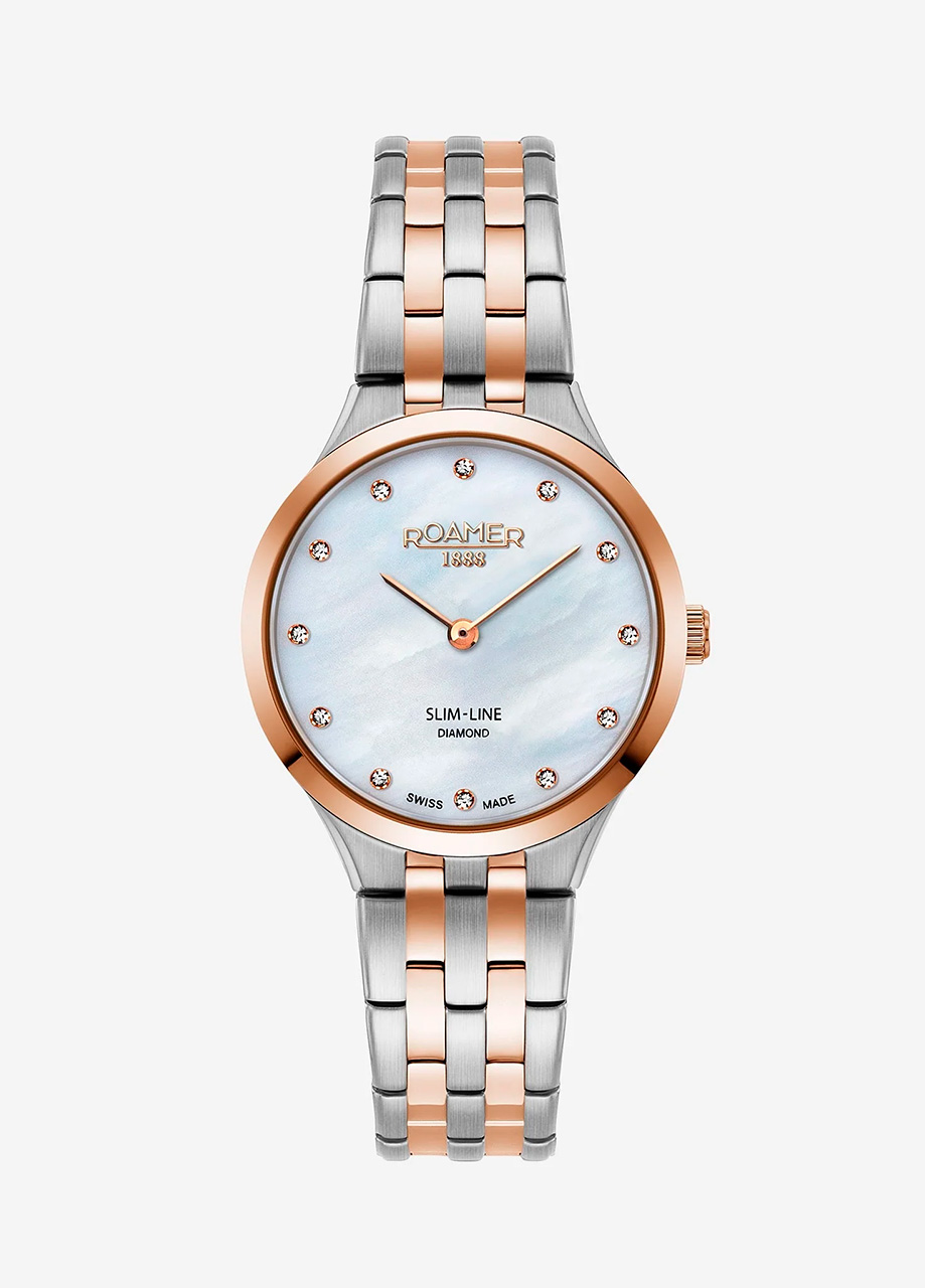 В новой модели SLIM-LINE BRILLIANT швейцарская компания ROAMER воплощает вечную элегантность элементов SLIM-LINE, придавая этим изысканным часам неповторимый женственный шарм и роскошную ауру. На белом перламутровом циферблате SLIM-LINE DIAMOND расположены 12 бриллиантов круглой огранки, деликатно закругленных, которые элегантно указывают часы, создавая мягкое мерцание. Дополняют циферблат две тонкие центральные стрелки, логотип ROAMER под отметкой "12 часов" и название модели над отметкой "6 часов", а также логотип Swiss Made. Отказавшись от минутных меток и секундной стрелки, циферблат SLIM-LINE DIAMOND придает возможность расслабиться и насладиться эстетическим течением времени.