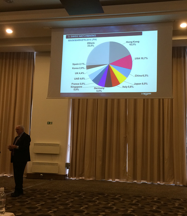 На конференции звучало множество фактов – про значимость часов для экономики Швейцарии, экспорт, соотношение между брендами и пр. Например, если брать всю швейцарскую промышленность, то первое место в экспорте занимают фармацевтика и химия – на их долю приходится 41 процент, на втором месте – машиностроение и электроника с 29 процентами, доля часовой индустрии – 10 процентов. По стоимости часов на первом месте с 55 процентами Швейцария, а вот по количеству произведенных часов лидирует Китай (97 процентов). Swatch Group, которой принадлежит Longines, включает 19 брендов, и расширение пакета продолжается, по миру сегодня доля группы составляет 20 процентов.
