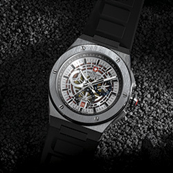 Вторая модель в прорывной коллекции Mission XFOR – теперь соответственно под номером «два». Смелый дизайн, более скелетонизированный по сравнению с первой моделью, циферблат, индексы – вместо арабских цифр, а прямые стрелки-батоны (с люминесцентным составом) гармонируют с прямоугольными черными часовыми метками. Серебристый циферблат контрастирует с черным силиконовым ремешком.