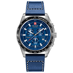 | 3. Swiss Military Hanowa Crusader Chrono 6-4225.04.003: корпус из нержавеющей стали 316L, безель с ионным покрытием чёрного цвета и тахиметрической шкалой, синий циферблат с часовыми индексами серого цвета, синий кожаный ремешок с белой прострочкой. | |