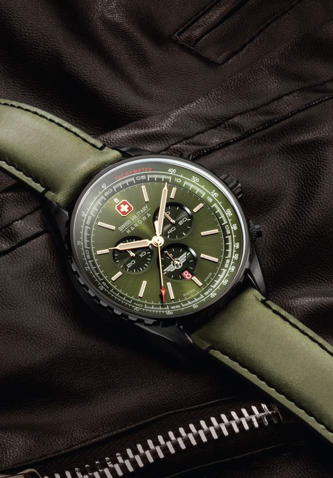 Высокоточный хронограф в авиационном стиле в корпусе диаметром 44 мм из оружейной стали. Суровый «зубастый» безель дополняет яркий циферблат цвета хаки с эффектом солнечных лучей с золотистыми часовыми индексами и стрелками-градусниками. Красный флаг Швейцарии на позиции «12 часов» поддержан красной датой на позиции «6 часов», а также с красным наконечником центральной стрелки хронографа. Счетчики глубоко утоплены и исполнены в темно-зеленом цвете.