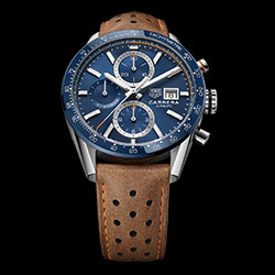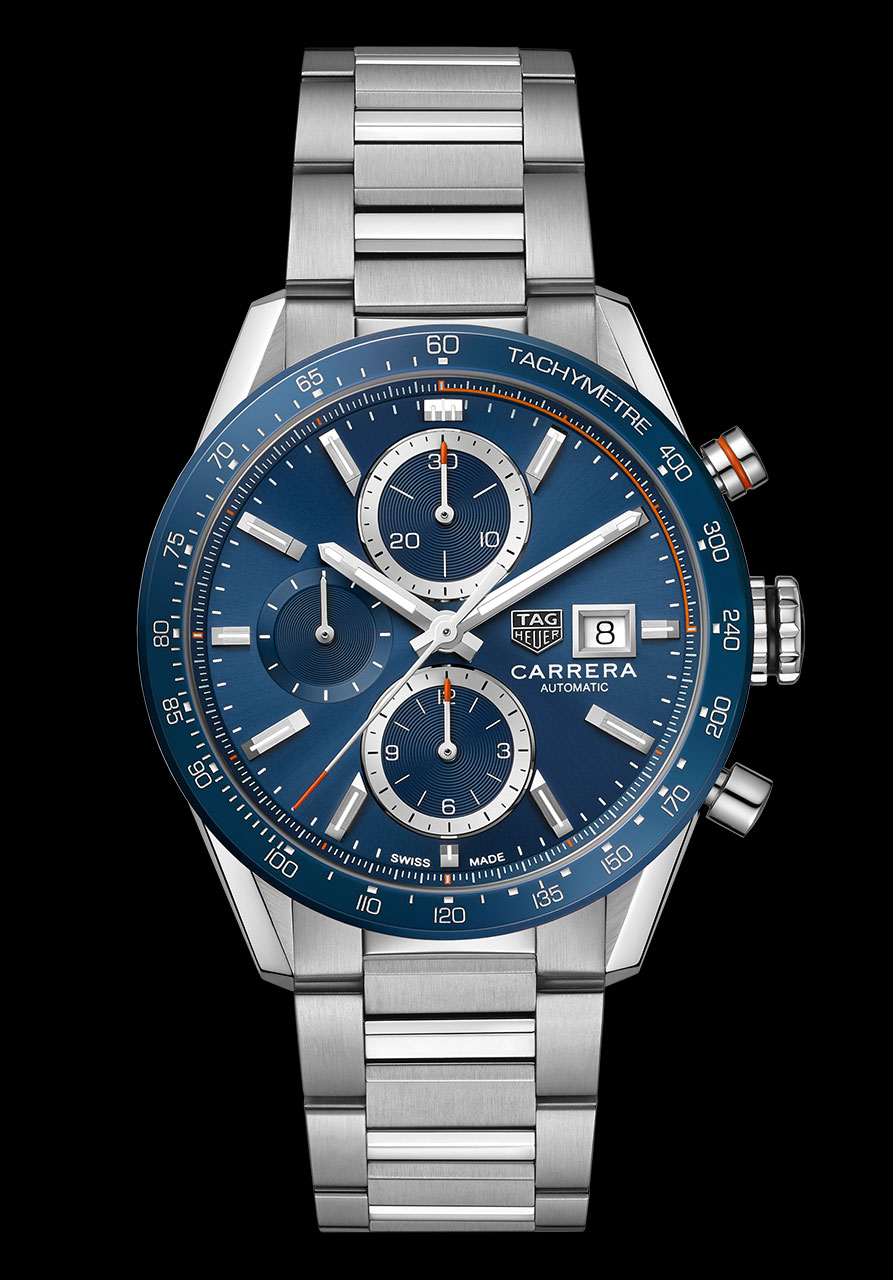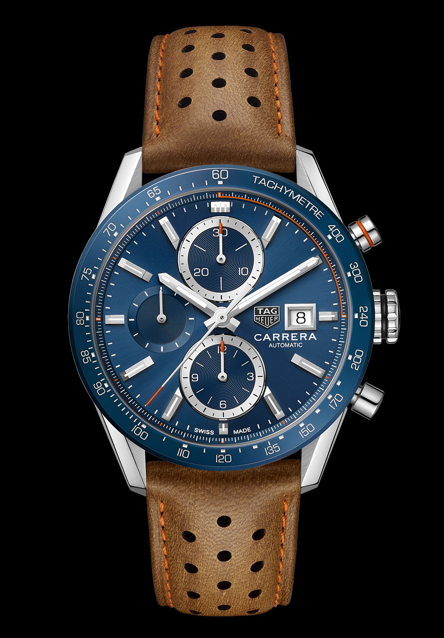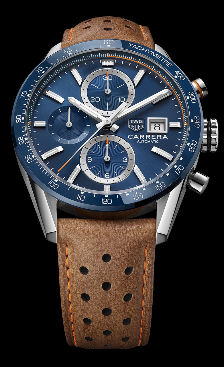 Самая запоминающаяся из четырех новых моделей — синие часы со светло-коричневым кожаным ремешком. Новые TAG Heuer Carrera представлены на перфорированном ремешке из телячьей кожи, а внутренняя сторона ремешка выполнена в оранжевом оттенке. В таком же цветовом решении отмечены и акценты на циферблате. Модель также представлена с синим циферблатом на браслете из нержавеющей стали. Коллекцию дополнили часы с черным циферблатом на браслете из нержавеющей стали и на ремешке из черной кожи с красной прострочкой.