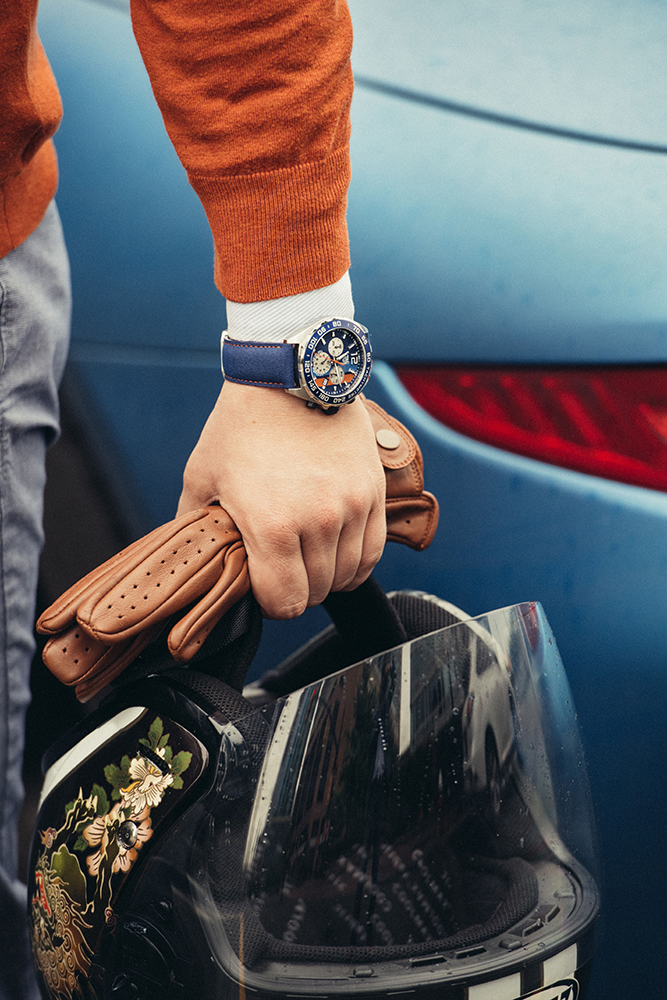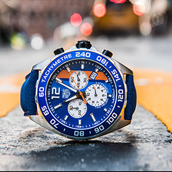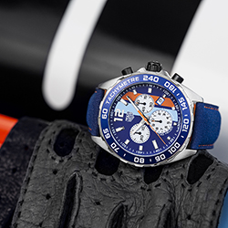 Две флагманские модели коллекций TAG Heuer выполнены в легендарных цветах компании Gulf – оранжевом и синем. Часы TAG Heuer Formula 1 идеально подходят для автоспорта – это синоним производительности и скорости. Изготовленный полностью из стали, с корпусом диаметром 43 мм этот кварцевый хронограф имеет рифленый безель из стали и кольцо из алюминия с нанесенной на него тахиметрической шкалой. Синяя и оранжевая полосы на циферблате напоминают об истории создания модели. О принадлежности к знаменательному событию свидетельствует логотип Gulf, выгравированный на задней крышке корпуса. Малый счетчик, который позволяет определить время с точностью до десятых долей секунды (что важно в часах для автомобильных гонок), расположен на отметке «6 часов». На отметке «9 часов» находится счетчик минут, а счетчик секунд – на отметке «3 часа». Модель TAG Heuer Formula 1 дополнена красивым ремешком из кожи синего цвета с оранжевой отстрочкой в стиле «спортивный шик».