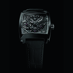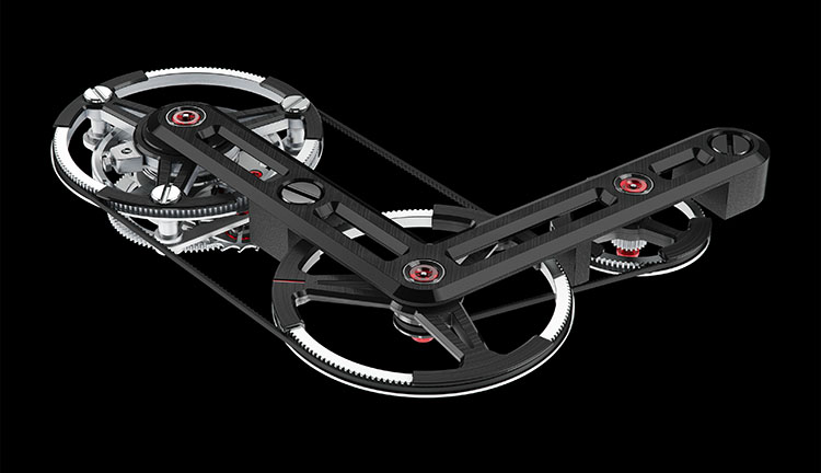 Вместе с механизмом установлен турбийон с ременным приводом, совершающий вращение со скоростью один оборот в минуту. Механизм обеспечивает функции часов, минут и секунд