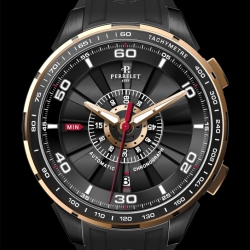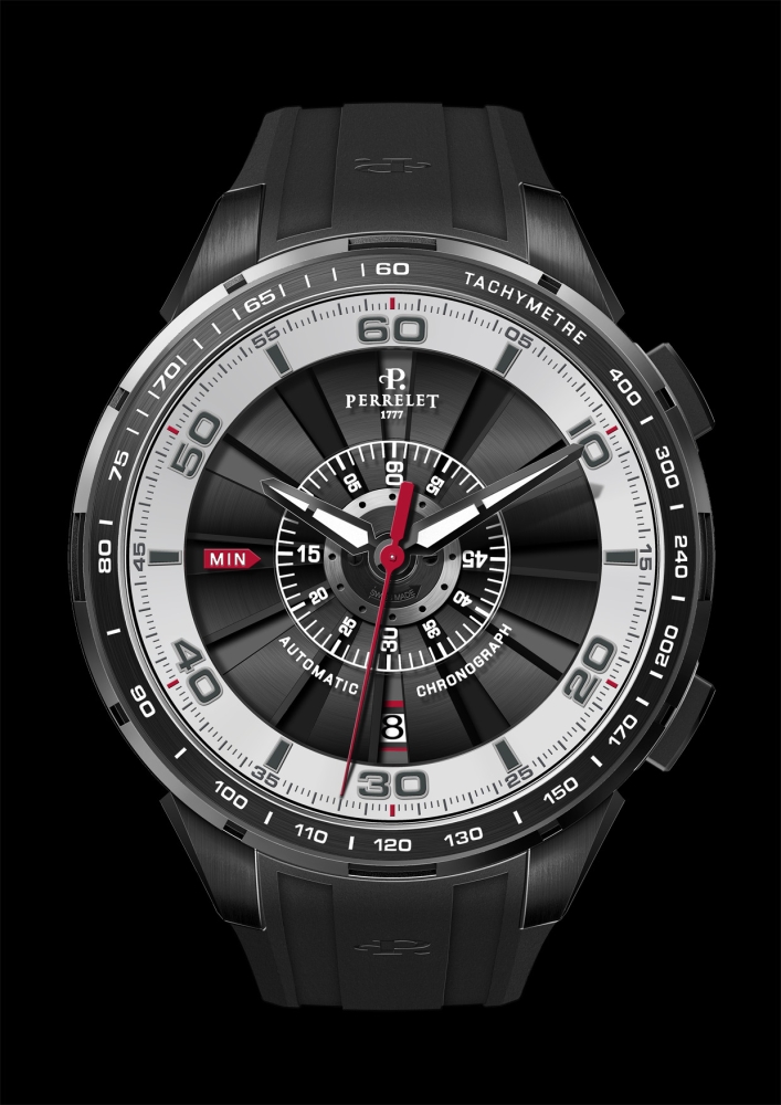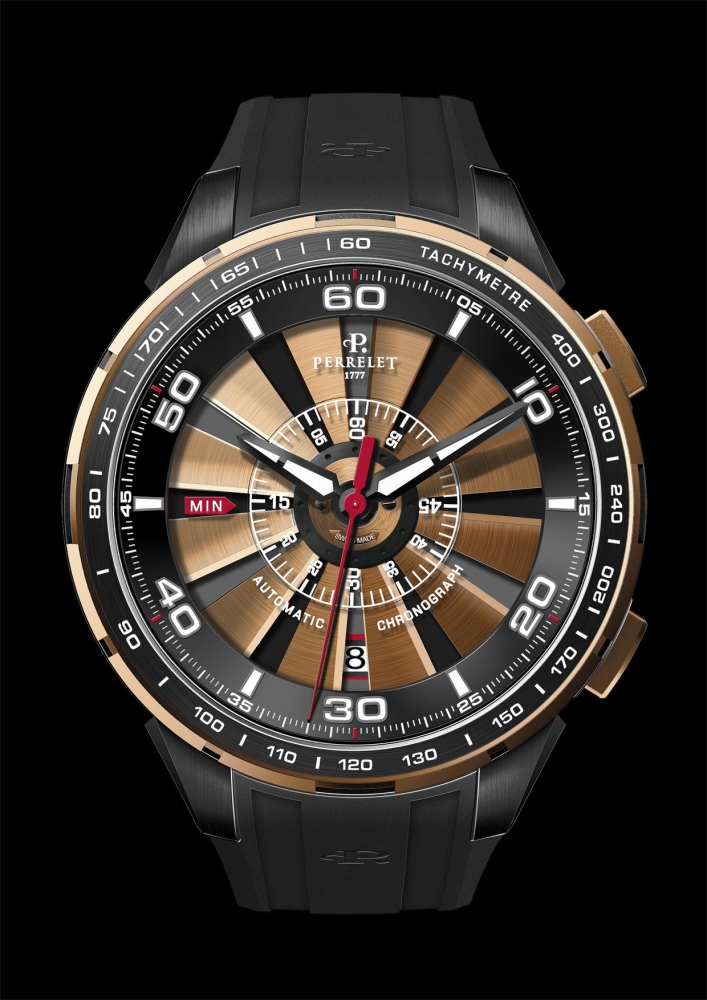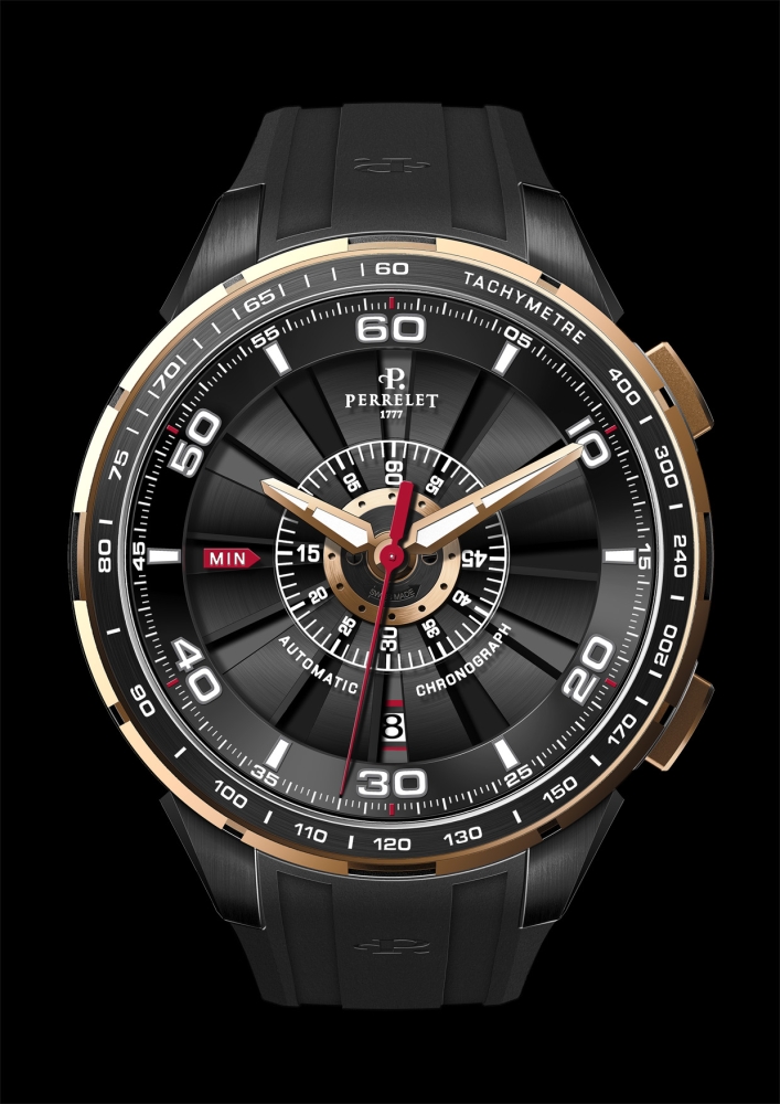 С 2009 года визитной карточкой старейшей швейцарской часовой марки «Perrelet» является коллекция «Turbine». Часы этой коллекции выделяются тем, что на циферблатах помещены двенадцать лопастей, напоминающих турбину, укреплённую на одной оси с ротором во время работы которого создаётся эффект вращающейся турбины выполняющей, по сути, декоративную функцию. Развивая эту новацию компания «Perrelet S.A.» выпустила множество дизайнерских версий «турбины», каждая из которых усиливала впечатление неповторимости этой инженерно-эстетической разработки. Так, например, были созданы часы, оснащённые светящимся циферблатом с вращающимися в завораживающем вихре лопастями. Кроме того, получила распространение версия для дайверов с турбиной в жёлто-синем оформлении, а также необычная версия часов с бриллиантовым черепом, который становился видимым при высокой скорости вращения «турбины». Безусловно, все эти модели, разные по своему дизайну и цветовому решению, в техническом плане были одинаковыми. И вот, через четыре года, компания «Perrelet S.A.» представила общественности принципиально новую разработку – хронограф «Turbine Chrono». Эти часы не только расширили популярную коллекцию «Turbine», но и ещё раз подтвердили высочайший уровень инженерно-технического потенциала компании.