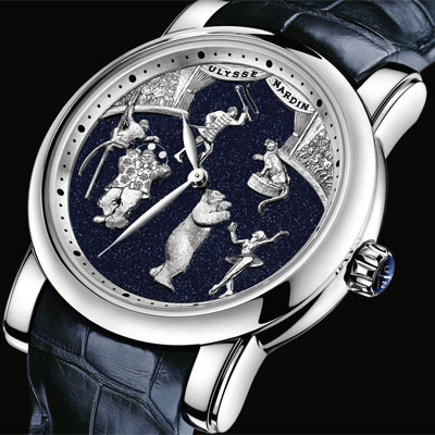 Новые часы «Circus Aventurine» компании «Ulysse Nardin» с минутным репетиром больше похожи на миниатюрный цирк бродячих артистов, которые совершают движения в такт мелодичному бою: медведь раздаёт поклоны изящной балерине, клоун жонглирует мячиками, их пытается поймать обезьянка, а дрессировщик грозит кнутом тигру, тигр, в свою очередь, машет лапой.