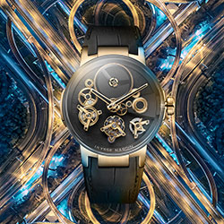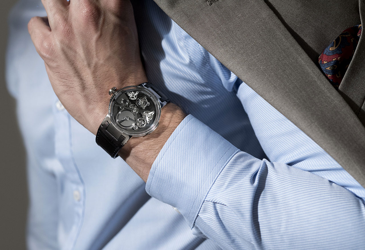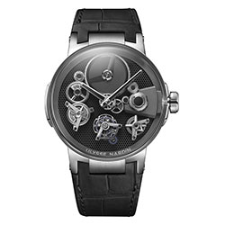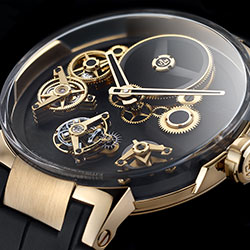 Глядя на форму модели, создается ощущение, будто часы парят высоко и бросают вызов гравитации. На циферблате не видно ни единого крепления деталей механизма, но присутствуют многие его составляющие: колесная передача, мосты в форме бумерангов, турбийон, скелетонизированные часовая и минутная стрелки, индикатор запаса хода на отметке «4 часа» (составляет 7 дней).