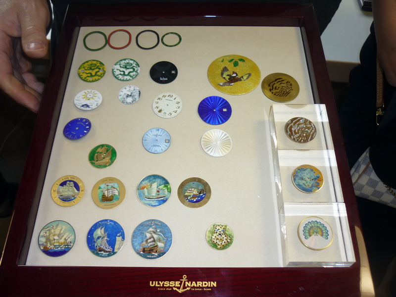 Понаблюдав за процессом, мы попали на фабрику Donzé Cadrans – здесь и только здесь создаются знаменитые эмалевые циферблаты. И не только для Ulysse Nardin, среди заказчиков, к примеру, Breguet, Patek Philippe. До недавнего времени фабрика была независимой, но в прошлом году Donzé Cadrans стала частью Ulysse Nardin. Техника нанесения перегородчатой эмали сродни ювелирному искусству. Канва рисунка наносится на циферблат тонкой золотой нитью. Затем внутрь вбивается порошок – в каждом сегменте сюжета он своего оттенка. При этом мастеру важно в каждый паз вложить порошка ровно столько, чтобы его не оказалась ни много - ни мало. Такую работу выполняет единственная женщина – она занимается этим делом уже больше 40 лет и, конечно, достигла совершенства.