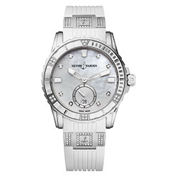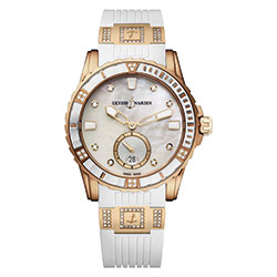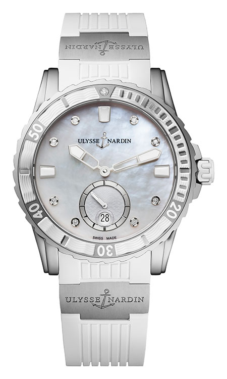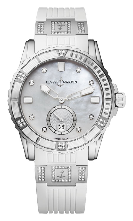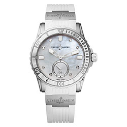 4. Ulysse Nardin Diver Lady 3203-190-3/10 Корпус из полированной нержавеющей стали. Безель с белым вулканизированным каучуковым покрытием и одним бриллиантом весом 0,013 карата. Белый перламутровый циферблат с центральными стрелками часов и минут, малой секундной стрелкой, окошком даты, с условными накладными индексами, восемь из которых являются бриллиантами общим весом 0,062 карата. Белый каучуковый ремешок, украшенный вставками из нержавеющей стали с логотипом Ulysse Nardin и раскладывающейся стальной застёжкой. |