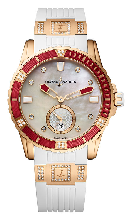 Новый женский хронометр «Ulysse Nardin Diver Lady» надёжно и комфортно удерживается на запястье каучуковым ремешком белого, сине-чёрного, а также белого с двумя красными полосками цвета. Ремешки украшены вариативными декоративными вставками: из18-каратного розового золота (5N), титана и нержавеющей стали. Розово-золотые и титановые вставки инкрустированы восьмьюдесятью бриллиантами общим весом 0,40 карата и гравированным якорем, вставки из нержавеющей стали украшает логотип Ulysse Nardin. Ремешок, в зависимости от варианта, снабжён розово-золотой, титановой или стальной раскладывающейся застёжкой.
