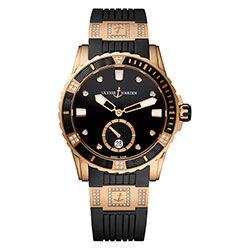 3. Ulysse Nardin Diver Lady 3202-190-3C/12.12 Корпус из полированного 18-каратного розового золота (5N). Безель с сине-чёрным вулканизированным каучуковым покрытием и девятнадцатью бриллиантами общим весом 0,115 карата. Сине-чёрный циферблат с центральными стрелками часов и минут, малой секундной стрелкой, окошком даты, с условными накладными индексами, восемь из которых являются бриллиантами общим весом 0,062 карата. Каучуковый ремешок сине-чёрного цвета со вставками из 18-каратного розового золота (5N), декором из восьмидесяти бриллиантов общим весом 0,40 карата, гравированным якорем и раскладывающейся розово-золотой застёжкой. |