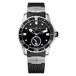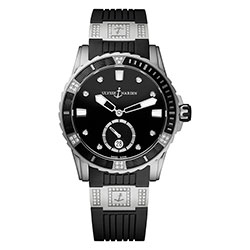 5. Ulysse Nardin Diver Lady 3203-190-3/12 Корпус из полированной нержавеющей стали. Безель с сине-чёрным вулканизированным каучуковым покрытием и одним бриллиантом весом 0,013 карата. Сине-чёрный циферблат с центральными стрелками часов и минут, малой секундной стрелкой, окошком даты, с условными накладными индексами, восемь из которых являются бриллиантами общим весом 0,062 карата. Каучуковый ремешок сине-чёрного цвета, украшенный вставками из нержавеющей стали с логотипом Ulysse Nardin и раскладывающейся стальной застёжкой. |